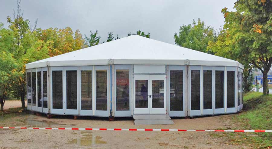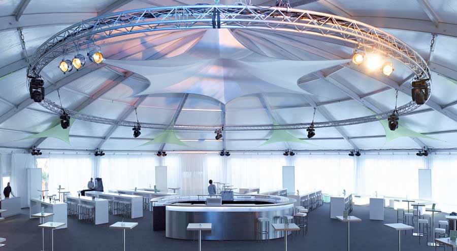 Rundzelte von LEUBE sind architektonische Blickfänge mit besonderer Raumwirkung. Durch ihre runde beziehungsweise sechseckige Form heben sie sich deutlich von klassischen Satteldachzelten ab und schaffen eine einladende, offene Atmosphäre.