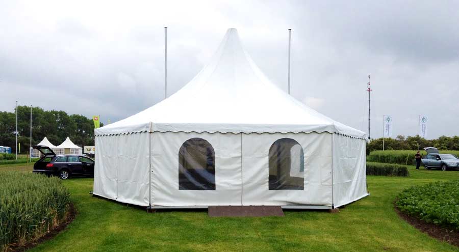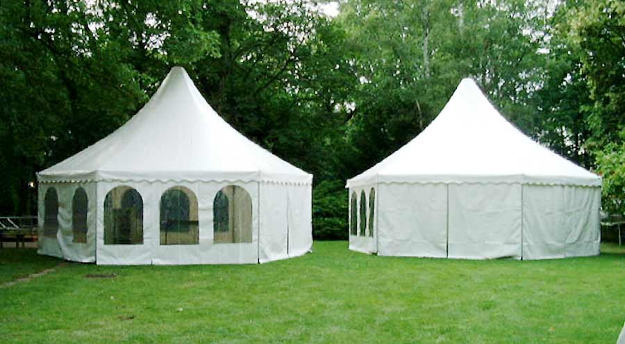 Der Pavillon ist sechseckig und lässt sich optimal mit unseren Kleinzelten kombinieren. Die Dachform entspricht dem klassischen Satteldach unserer Klein- und Großzelte, wodurch ein harmonisches Gesamtbild entsteht.